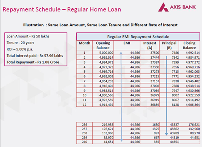 Instead of EMIs (equated monthly installments), the customer will pay reducing monthly installments. While the initial installments will be higher (than the EMI on the same loan amount for the same tenure), the installment amount keeps reducing throughout the loan tenure.