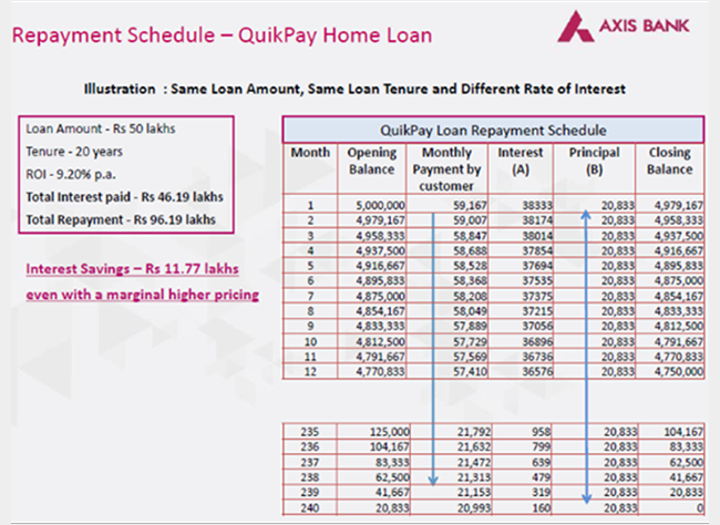To illustrate the offering, let’s consider a typical home loan of Rs. 50 lacs for 20 years at 9.00% pa. This loan will have a total interest outgo of Rs. 57.96 lacs over 20 years for the customer. However, with Axis Bank’s QuikPay Home Loans, for a loan of Rs. 50 lacs for the same tenure, even with a slightly higher annual rate of interest of 9.20%, the overall interest outgo will be only Rs 46.19 lacs, thereby resulting in an overall saving of Rs 11.77 lac for the customer.